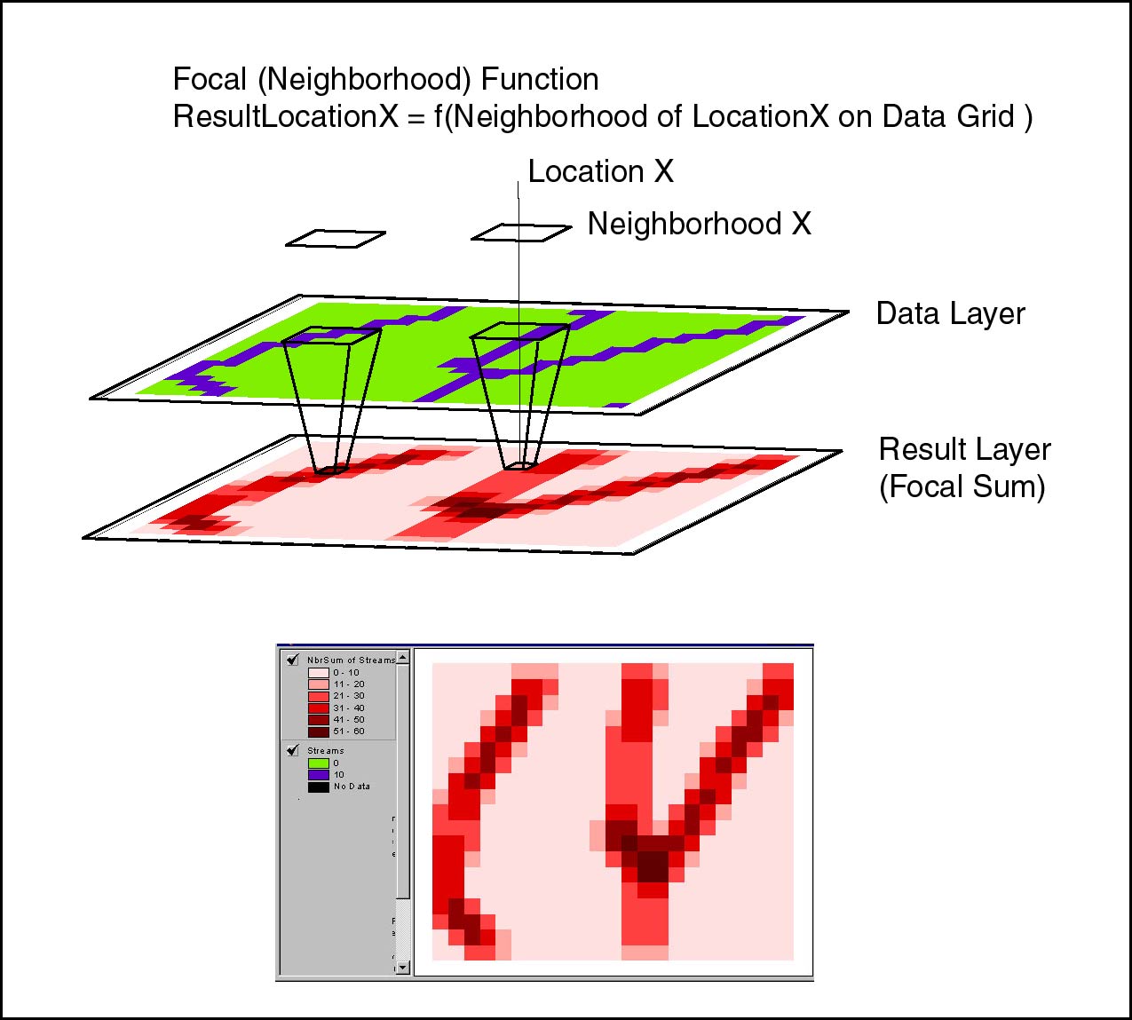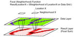 Output = Focal Function(Neighborhood shape, Data Raster) Values of cells in output are determined by summary of values of input data raster within a predefined neighborhood shape.