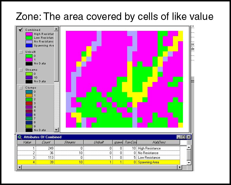 Raster Entites: A raster is an arrangement of regularly shaped, contiguous cells that fit together edge-to-edge to form a continuous layer. Typically the cells in a raster are square, but occaisionally you may see references to hexagonal rasters. The fundamental element of information in a raster GIS is a cell representing a location. Cells are arranged in layers. Each cell in a layer has a value that indicates some characteristic of that location. All cells having the same value constitute a 'zone'. A data set can be composed of many layers covering the same geographical areas.