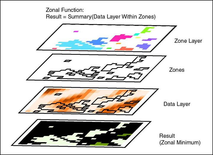 Values of cells in output reflect data values summarized within a particular zone in the input raster.(With associated recode and clump functions to re-arrange zones)
